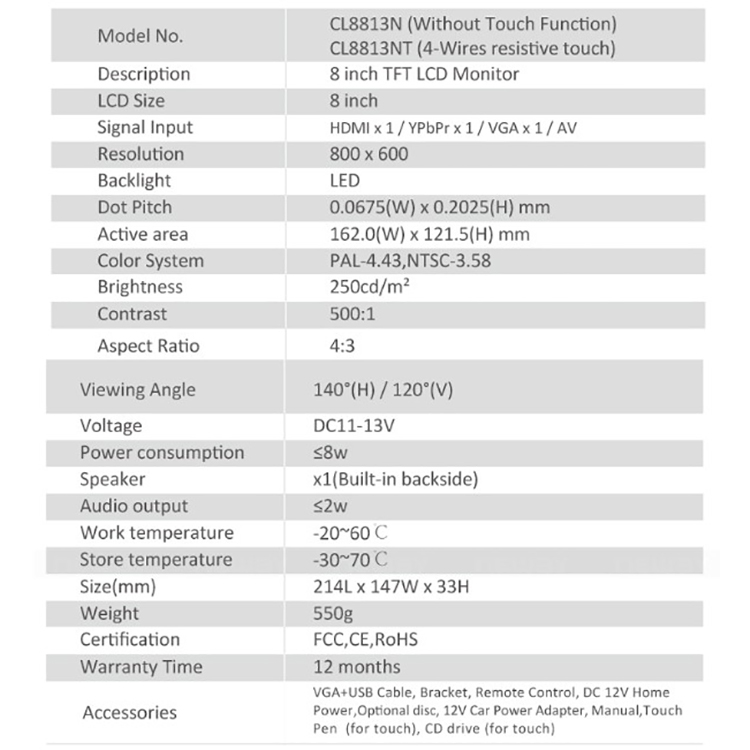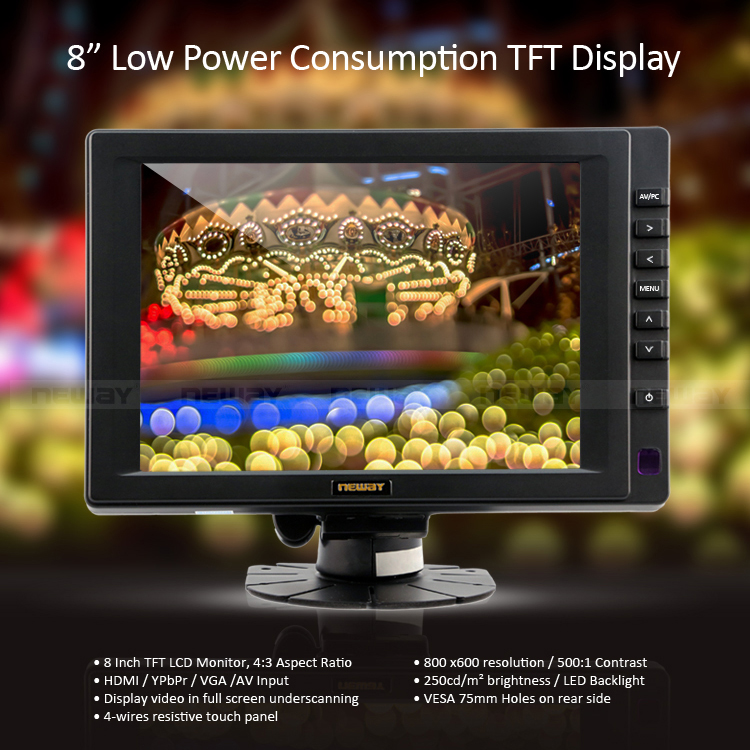 * 8" TFT LCD Monitor, 4:3 Aspect Ratio