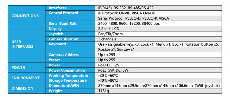 * Control protocol by VISCA, VISCA Over IP, Onvif and Pelco P&D