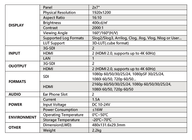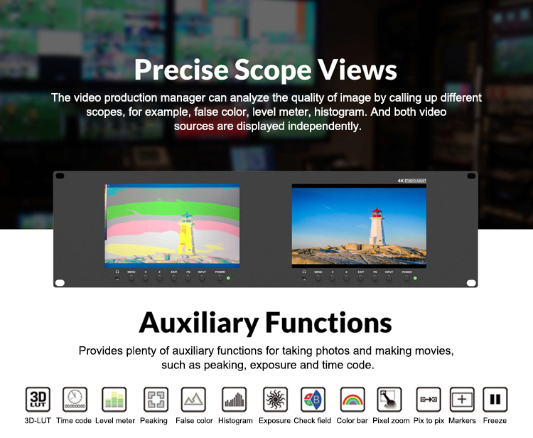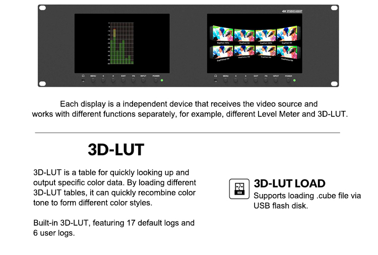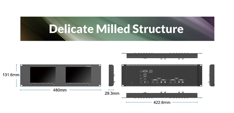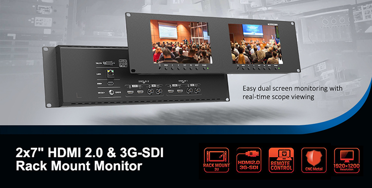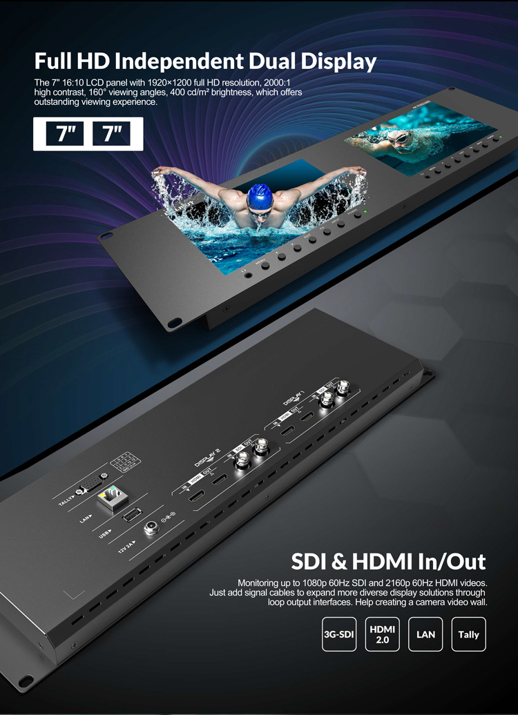 3RU rack mount monitor with dual 7” IPS screens, which is suitable for monitoring from two different cameras simultaneously.It comes with SDI and HDMI input and output, which support up to 1080p 60Hz SDI and 2160p 60Hz HDMI videos. Just add signal cables to expand more diverse display solutions through loop output interfaces. Help creating a camera video wall.