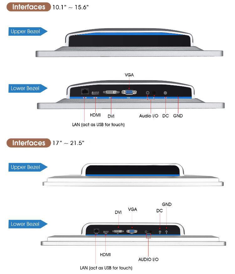 * HDMI, VGA, DVI, RJ45 act as USB for touch