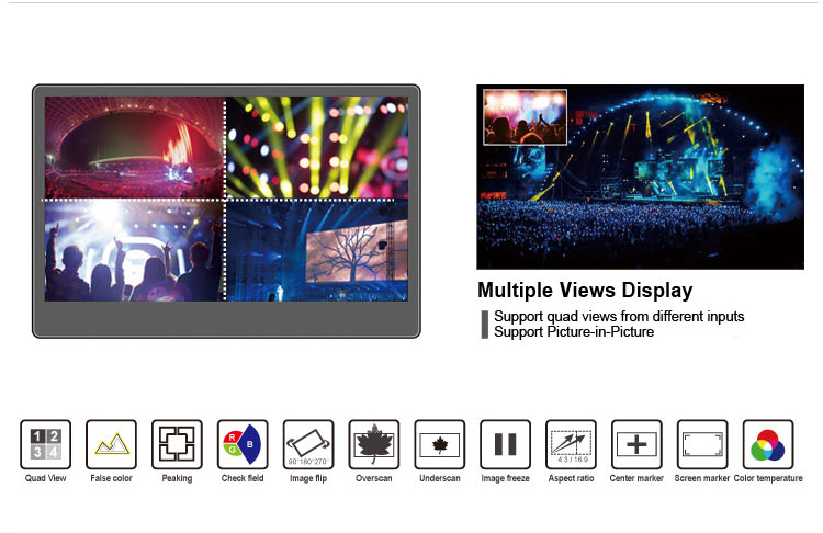 This is a broadcast director monitor, which developed specifically for FHD/4K/8K cameras, switchers and other signal transmission devices. Features 3840x2160 Ultra-HD native resolution screen with fine picture quality and good color reduction. It’s interfaces support 3G-SDI and 4×4K HDMI signals input and display; And also supports Quad views splitting from different input signals simultaneously, which providing a efficient solution for applications in multi-camera monitoring.