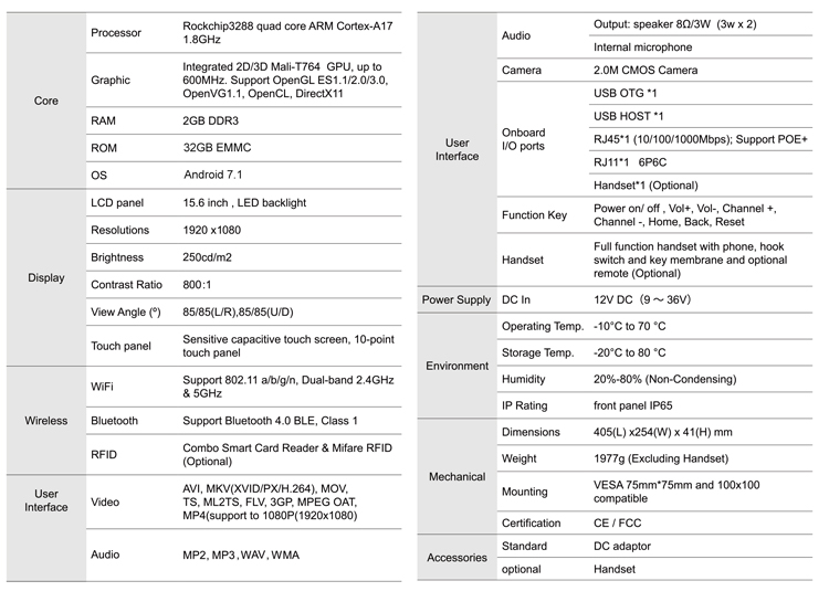* WIFI/ BT/ Camera/ POE, Optional RFID