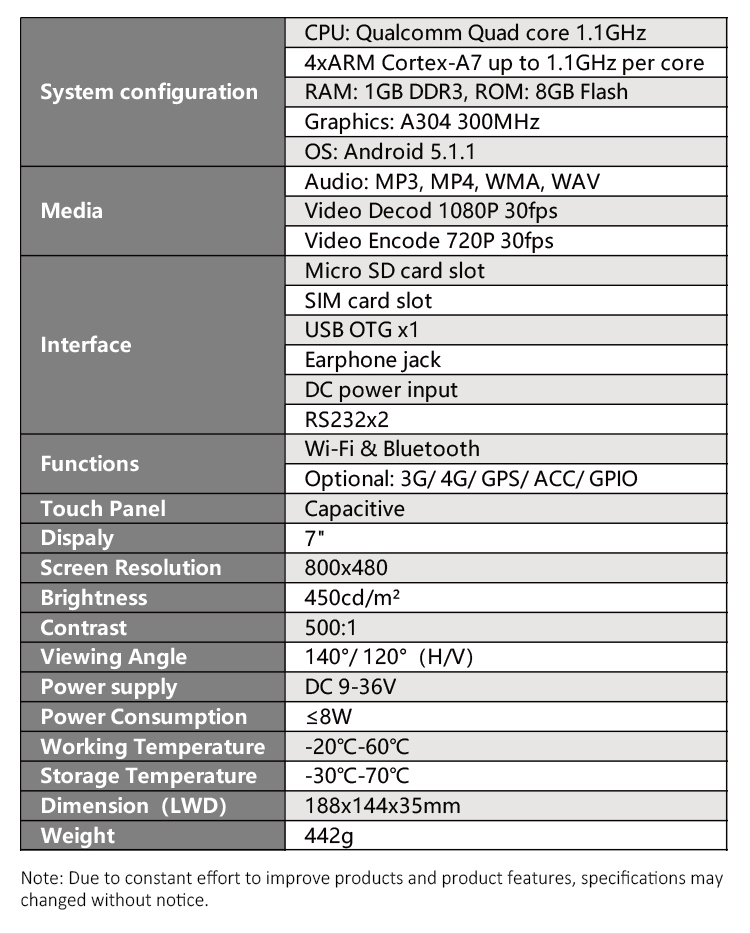 * 800x480 Resolution, 450cd/㎡ Brightness