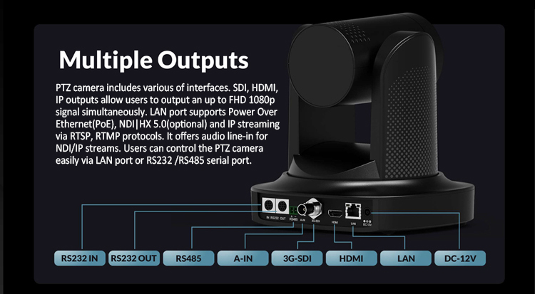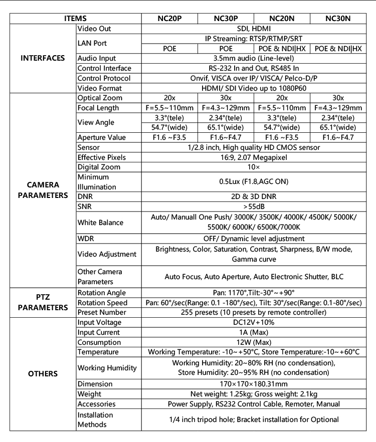 * Control Protocols : Onvif, VISCA over IP, VISCA, PELCO-D/P