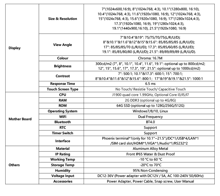 This series has 7”, 8”, 10.1”, 10.4”, 11.6”, 12”, 15”, 15.6”, 17”, 17.3”, 19” and 21.5” for options, and with powerful CPU ( default with J1900, optional Core I3/I5/I7). Comply with IP65 water & dust proof seamless true flat panel design, they can be suitable for most industrial applications use, such as KIOSK, POS, ATM, Industrial Manufacturing, and so on.